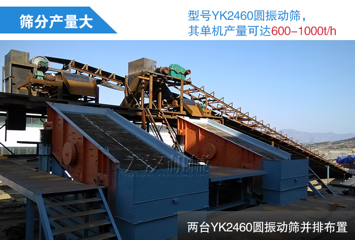 型號YK2460圓振動篩,其單機產(chǎn)量可達600-1000t/h,在時產(chǎn)2000噸的鐵礦石生產(chǎn)線中,兩臺YK2460圓振動篩并排布置,便可輕松達到生產(chǎn)線篩分產(chǎn)量要求,篩分產(chǎn)量是非??捎^的。
